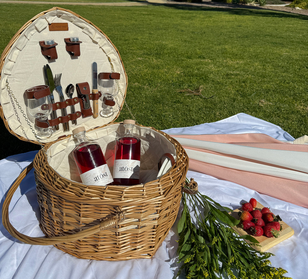 One lucky winner will receive 2 bottles of atōst, a Picnic Time heart-shaped basket, and a Beach State umbrella.