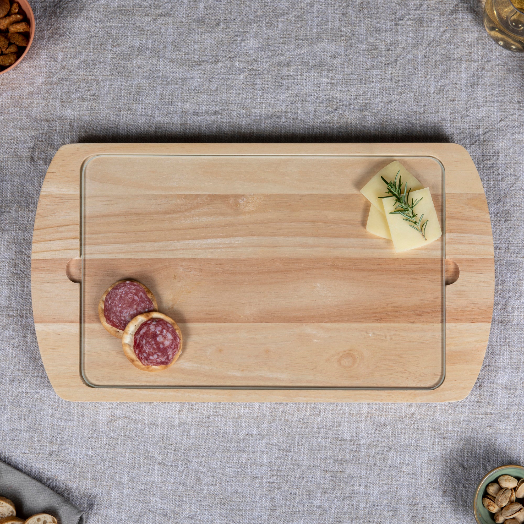 Bright and refined, the Billboard Glass Top Serving Tray is a parawood cutting board with a removable and customizable glass plate top.