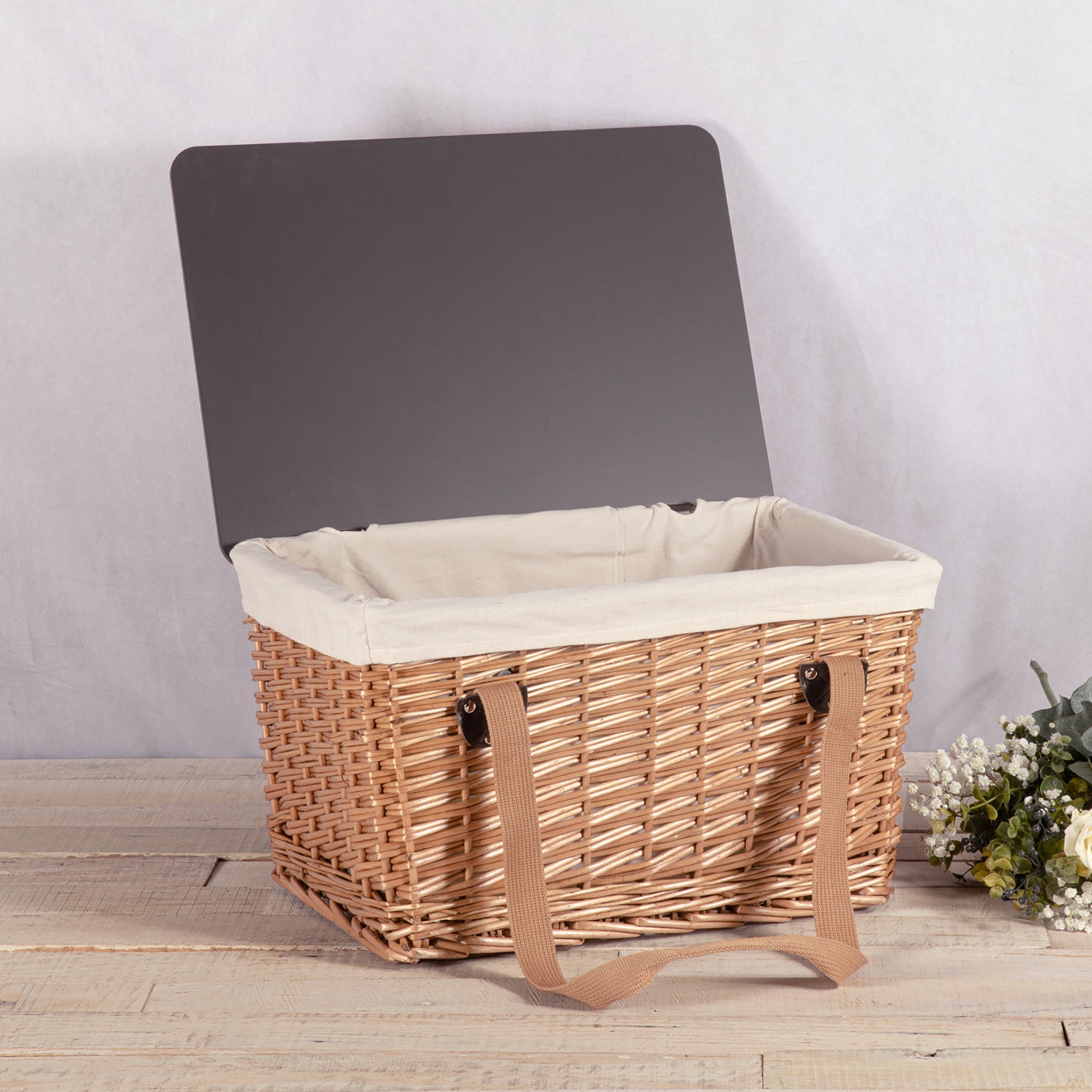 The Canasta Grande Wicker Picnic Basket with Lid is an easy and elegant English style picnic basket for 2. This vintage-chic picnic set is large enough for all your picnic fare, yet compact enough for easy transport.