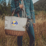 On the plus side, this one came with the picnic supplies in the basket in cute little carrying bags. The basket bottom allows the bag to stand up easily without tipping, and I think it would take up less space to pack in luggage to take along on a trip (say, to Paris, where it was hard to find a picnic basket) and it was fairly comfortable to carry.