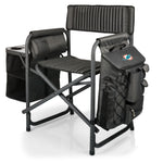 The Miami Dolphins Fusion Camping Chair is a heavy duty portable camp chair with so many features, you might make it your new office! A durable, powder-coated aluminum frame and ribbed padding in the seat and back rests is only the beginning - this outdoor chair with table on the right side also includes a two-tiered, accordion-style shelves hanging below, plus a side-mounted, fully-detachable 24+1-can-capacity cooler with its own backpack straps, a cell-phone-specific pocket, specialized fabric loops for an umbrella or sports banner, and numerous pockets. Show off your team spirit everywhere you go with this chair, adorned with your favorite team's logo across the back and cooler. The Fusion is more than an outdoor portable chair, it's a camp chair, a beach chair, and heck - a lawn chair relaxation throne. All that and it’s still lightweight enough to be easily portable yet strong enough to hold up to 350 lbs?! This is an outdoor directors chair that never disappoints.