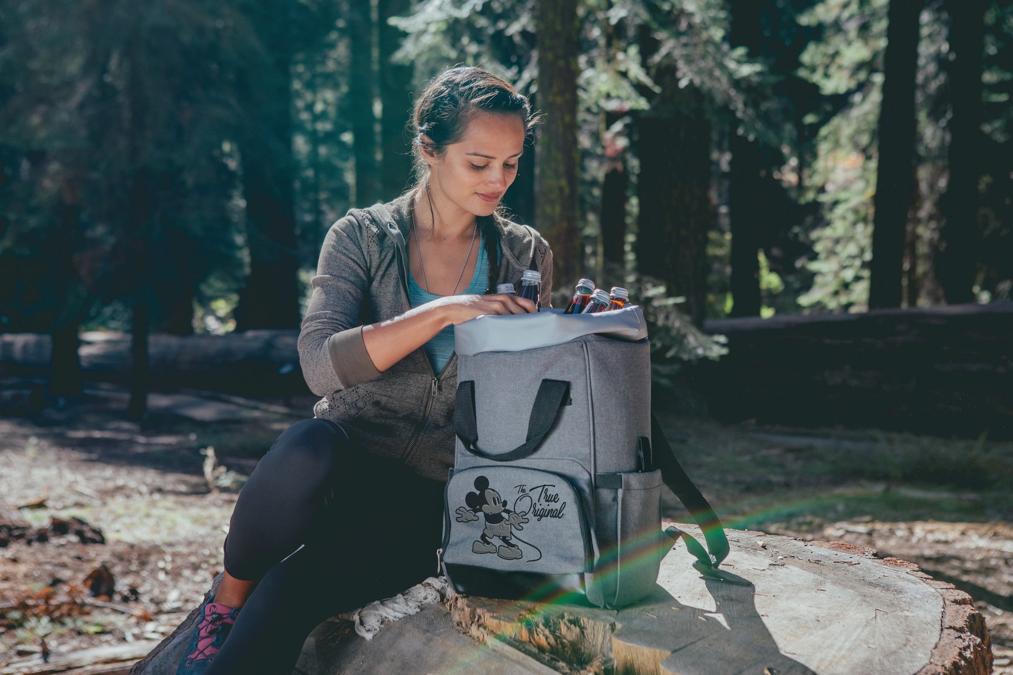 With the Mickey Mouse OTG Roll-Top Cooler Backpack, you can ditch the bulky cooler on wheels and carry your chilled party favors in total comfort and style. With space for up to 42 cans of your favorite beverages, as well as front and side storage compartments, a bottle opener, and comfy padding - you'll be able to take the party with you with ease. You and Mickey are true originals! That's why we built this unique and functional cooler bag.