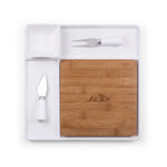 The New York Jets Peninsula Cutting Board & Serving Tray is a deluxe white porcelain serving platter with a reversible bamboo cutting board, a porcelain bowl, and a full-tang stainless steel cheese knife & fork set.