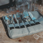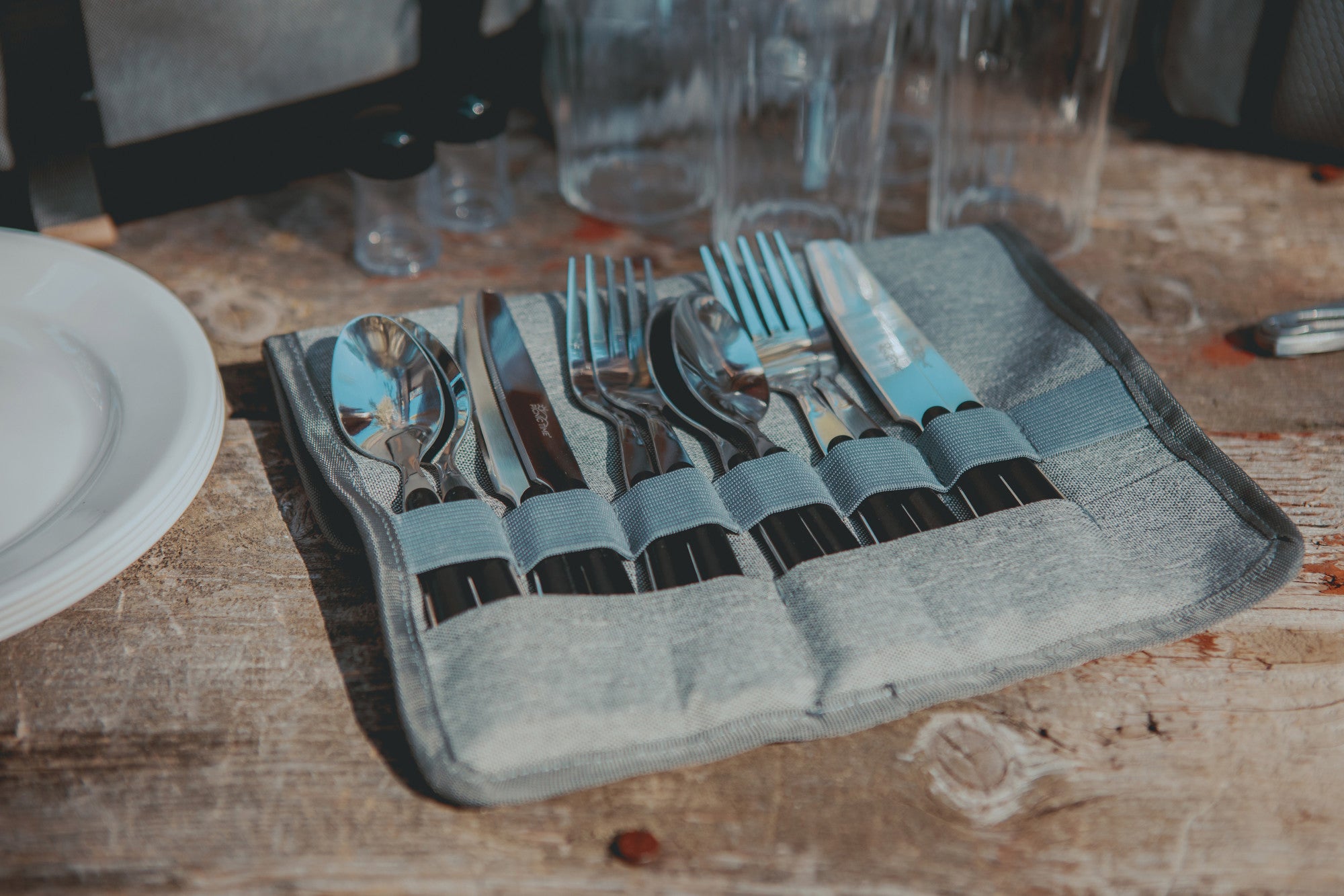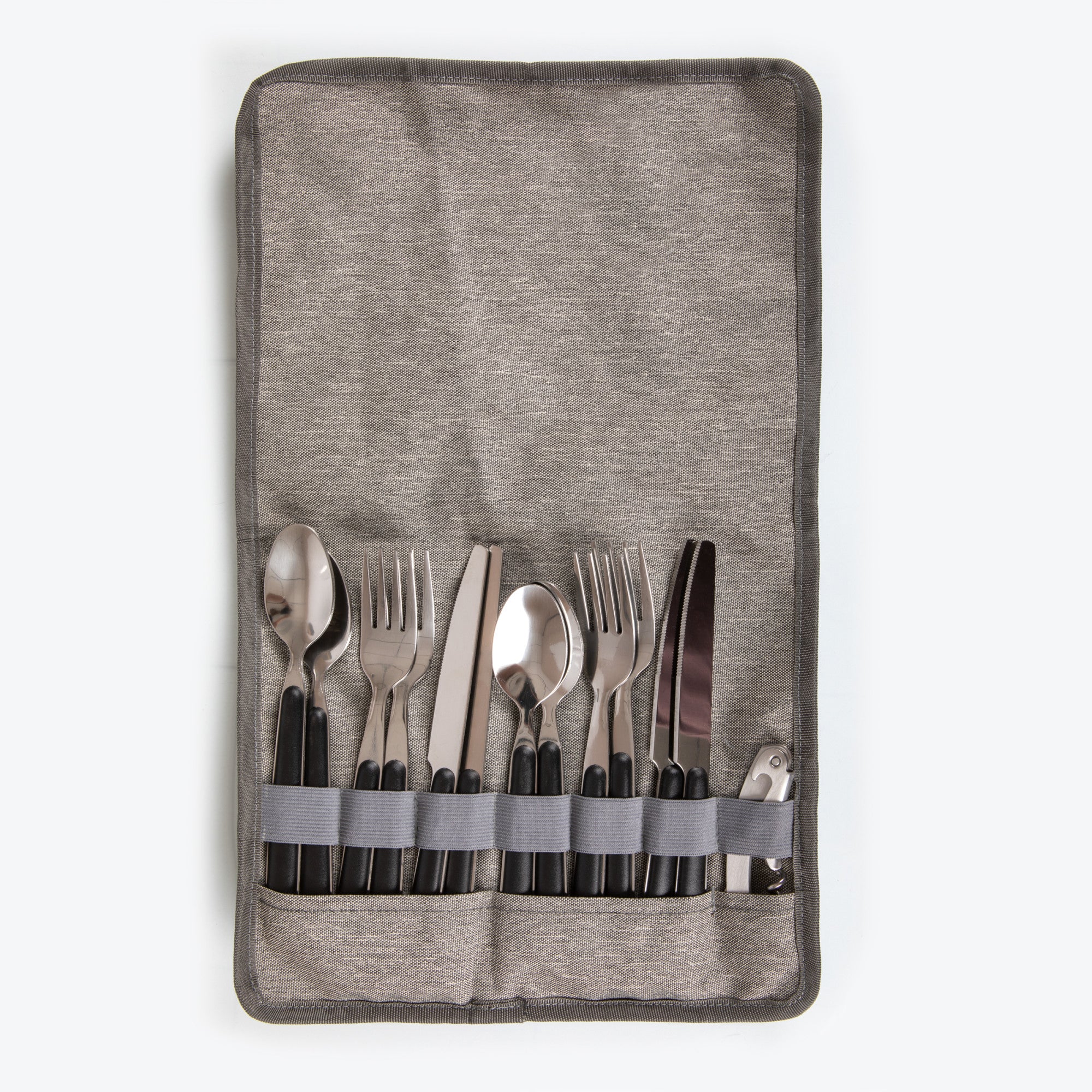 - Includes four 8’’ Melamine plates, four sets of stainless steel forks, knives and spoons,salt and pepper shakers, four durable tumblers, and one stainless steel waiter-style corkscrew