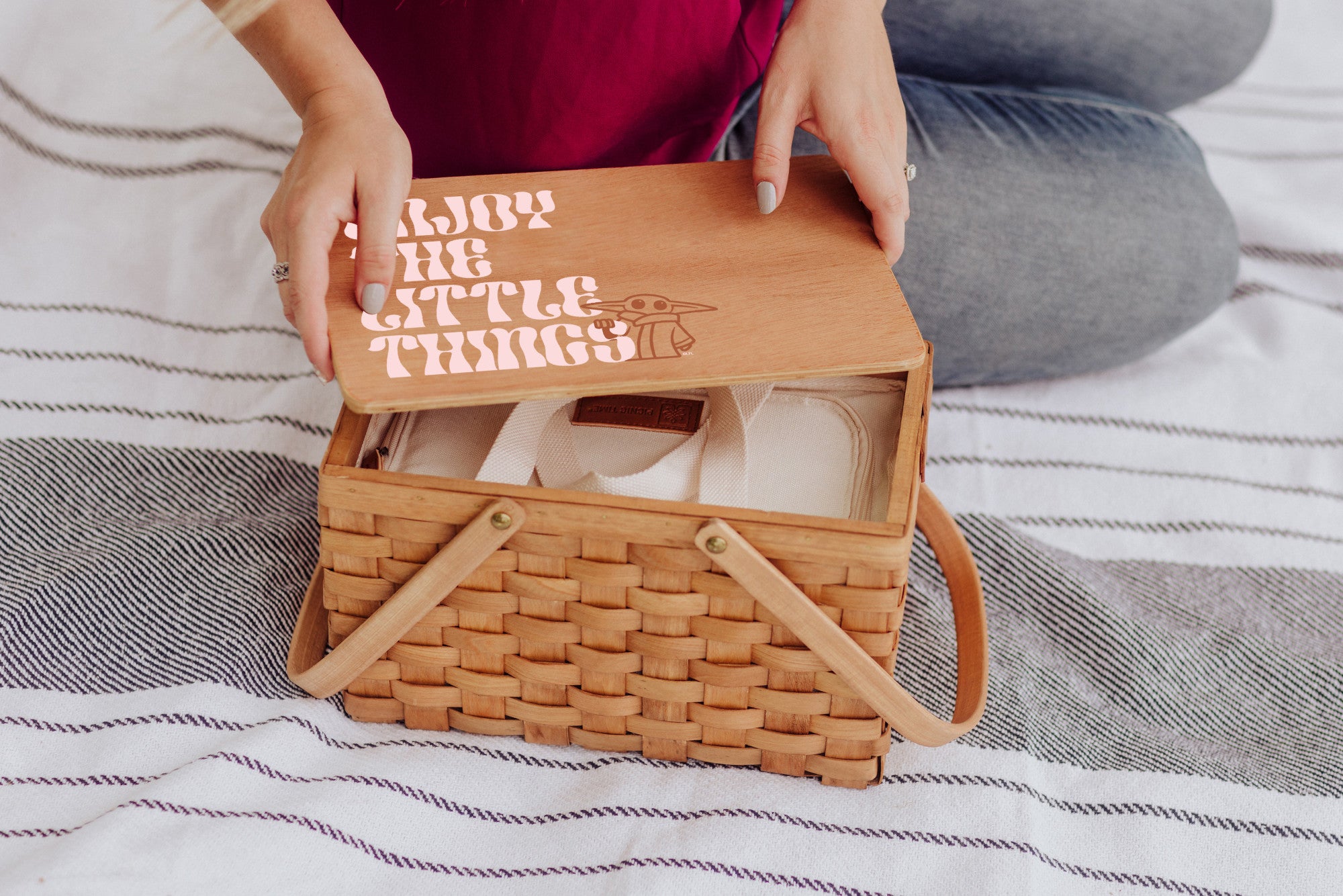 Grogu Poppy Personal Picnic Basket is a handwoven wicker basket ideal for bringing a little vintage Star Wars charm to your office lunch or for toting drinks and snacks to an outdoor concert.